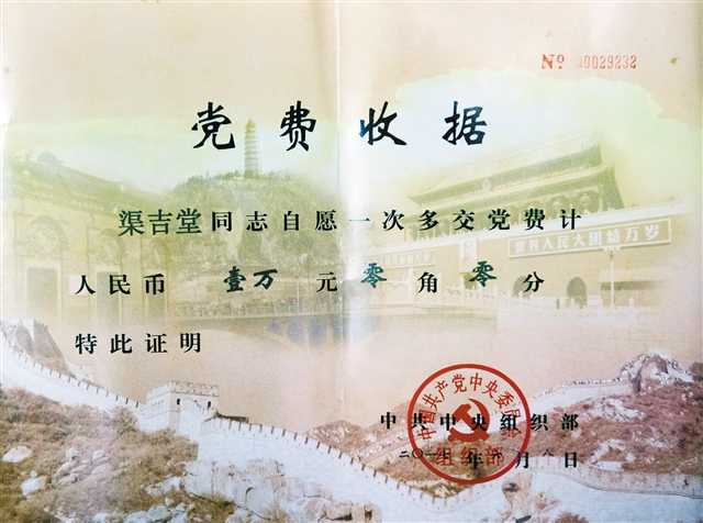 渠吉堂老人萬元“特殊黨費(fèi)”收據(jù)。首席記者 謝智強(qiáng) 翻拍