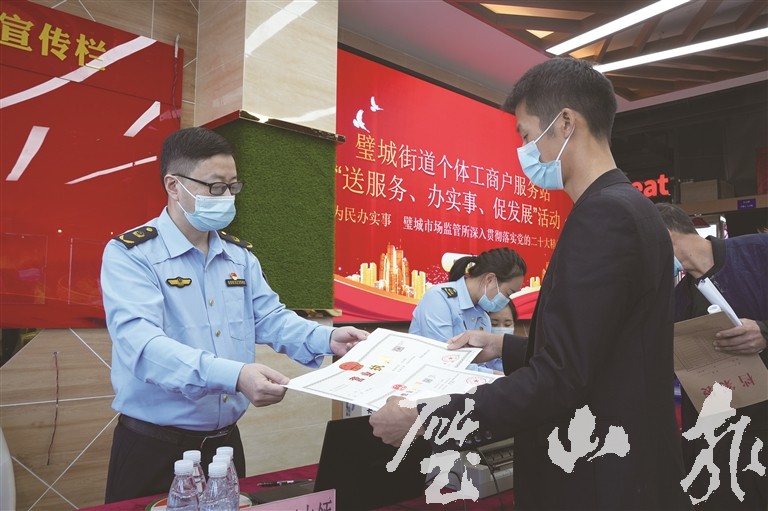 工作人員為經(jīng)營者發(fā)放營業(yè)執(zhí)照