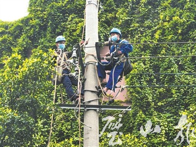 在施工時,璧山供電公司優(yōu)化了施工流程,采用多班組、跨專業(yè)集中施工,帶電作業(yè)和停電作業(yè)相結(jié)合的方式,避免了臺區(qū)重復(fù)停電。同時在現(xiàn)場掛設(shè)接地線、設(shè)置警示標(biāo)識、清理超高樹障,安排紅巖共產(chǎn)黨員服務(wù)隊員向商戶和行人進(jìn)行溝通解釋,引導(dǎo)行人和車輛安全通行。