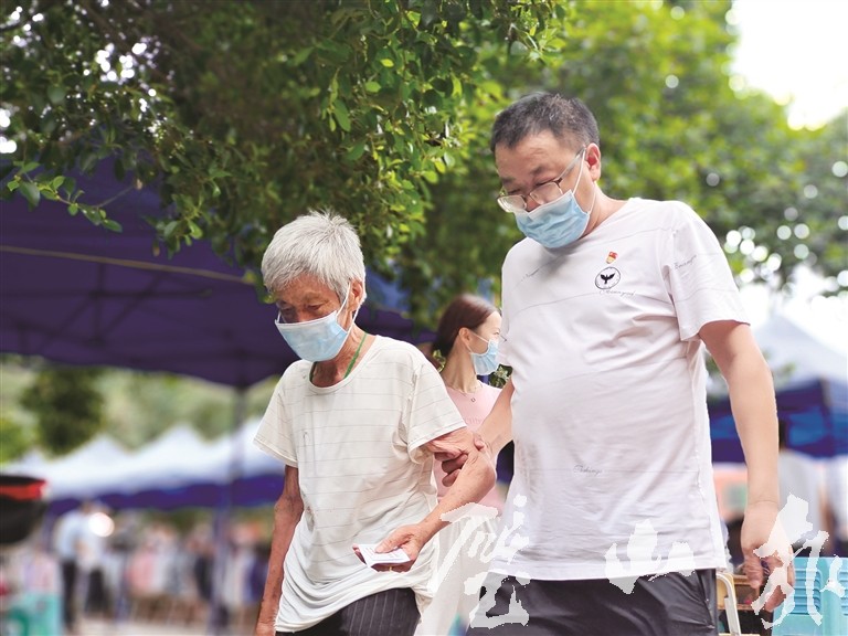 廣普鎮(zhèn)一機(jī)關(guān)干部攙扶年老村民前往臨時接種點接種新冠疫苗