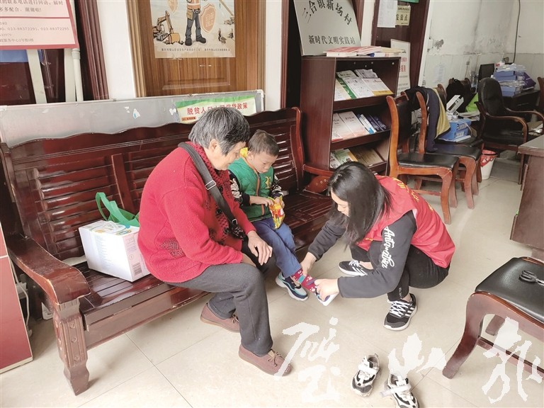 志愿者為孩子們穿上新鞋