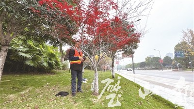 12月25日,在雙星大道道路兩側(cè),施工人員正在給兩旁的綠化樹木懸掛彩燈,還有幾名工人手拿工具檢查線路、調(diào)整燈帶、串聯(lián)電路,整個現(xiàn)場繁忙而有序。