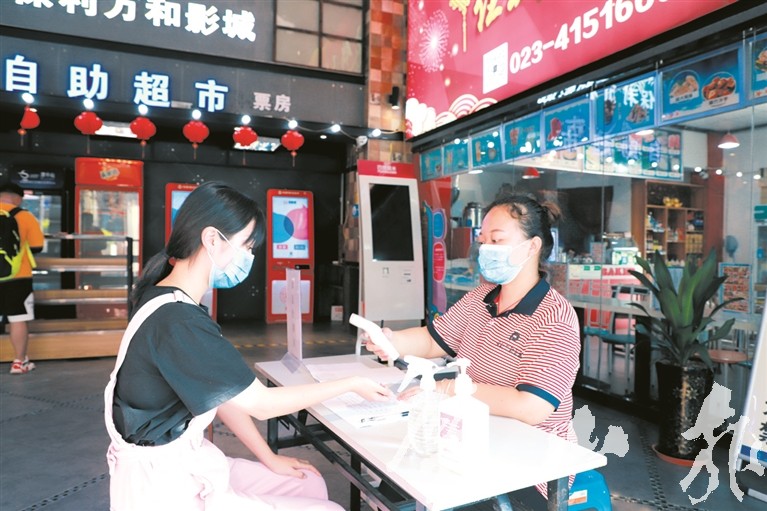 影院營業(yè)當(dāng)天下午4點05分,保利萬和國際影城南門唐城店,即將開場的電影《尋夢環(huán)游記》迎來了復(fù)映后的首批觀眾。記者在現(xiàn)場看到,影院入口設(shè)置了觀眾信息登記臺,大廳內(nèi)隨處可見“無接觸觀影”宣傳資料和“今日已消毒”指示牌,工作人員正在給觀眾測量體溫,檢驗渝康碼并進行實名登記,提醒觀眾觀影期間必須全程佩戴口罩,而場外的零食賣品部也遵照規(guī)定沒有開業(yè)。