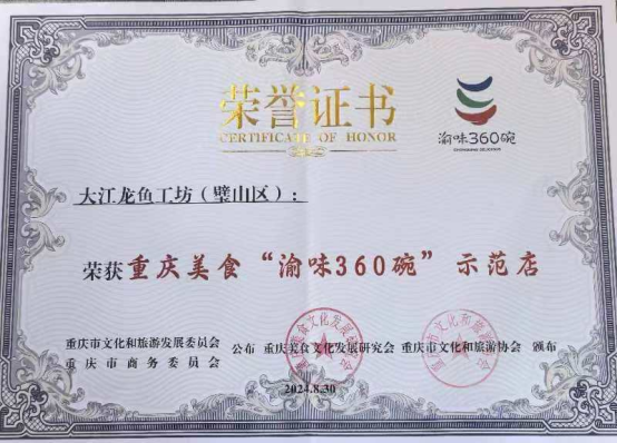 與此同時,大江龍魚工坊憑借其深厚的文化底蘊、精湛的烹飪技藝、優(yōu)雅的就餐環(huán)境以及卓越的服務質(zhì)量,在眾多參選店鋪中脫穎而出,榮獲“渝味360碗”示范店榮譽。這一稱號不僅是對大江龍魚工坊整體實力的肯定,更是對其在推動重慶美食文化傳播、提升重慶美食知名度和美譽度方面所做貢獻的高度贊揚。