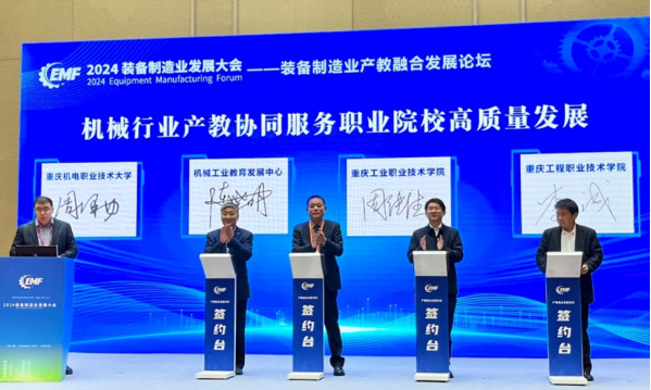 12月4日上午,重慶機電職業(yè)技術(shù)大學(xué)與機械工業(yè)教育發(fā)展中心合作共建職業(yè)本科簽約儀式在重慶悅來國際會議中心舉行。學(xué)校理事會執(zhí)行理事長周澤揚、學(xué)校常務(wù)副校長徐益出席簽約儀式。周澤揚執(zhí)行理事長代表學(xué)校與機械工業(yè)教育發(fā)展中心主任陳曉明簽約。