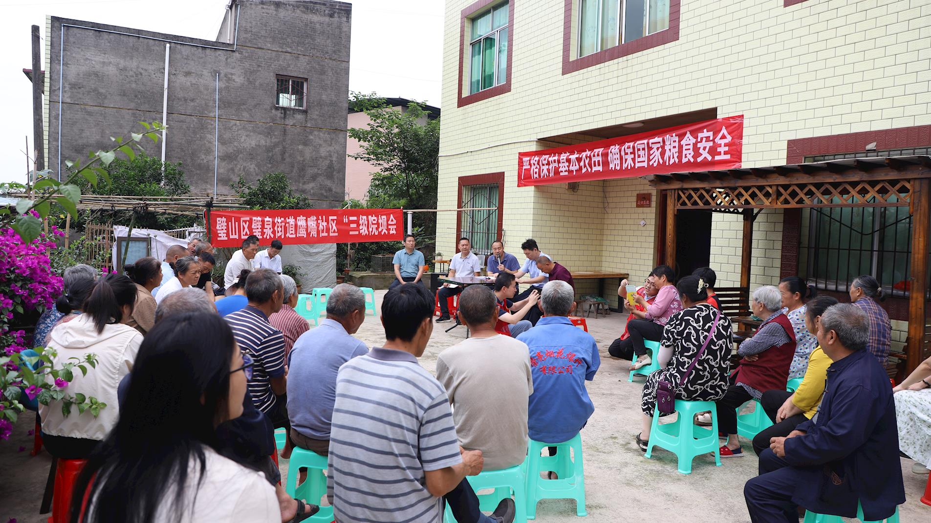 璧泉街道鷹嘴社區(qū)“三級院壩會”,黨員干部向居民宣傳耕地保護(hù)知識。