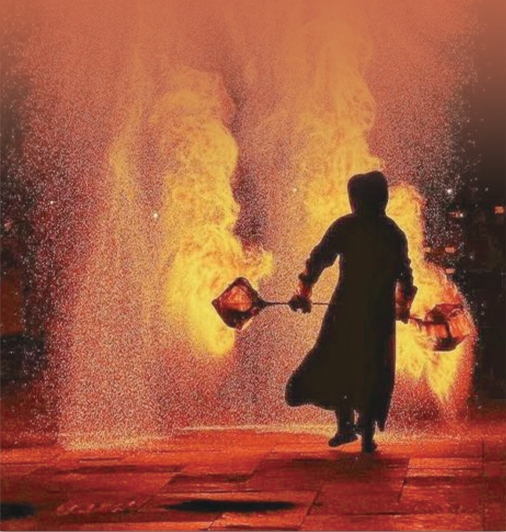 在現(xiàn)場(chǎng),表演者將燒紅的木炭置于鐵網(wǎng)中,通過(guò)抖動(dòng)產(chǎn)生如煙花般的火花,一時(shí)間,熊熊火焰騰空飛舞,絢麗奪目的美景引得游客連連叫好。