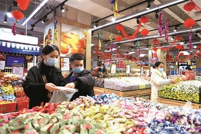 1月26日,市民在永輝超市(時代商都店)內選購糖果。春節(jié)將至,年味愈濃。轄區(qū)內各大超市紛紛將干果、糖果等年貨擺放在顯眼位置方便顧客挑選,一些包裝上帶有“?!薄芭D甏蠹薄靶履臧l(fā)財”等圖案或者文字的糖果更是受到市民青睞。(記者 王鋒 實習生 黃欣林 攝)