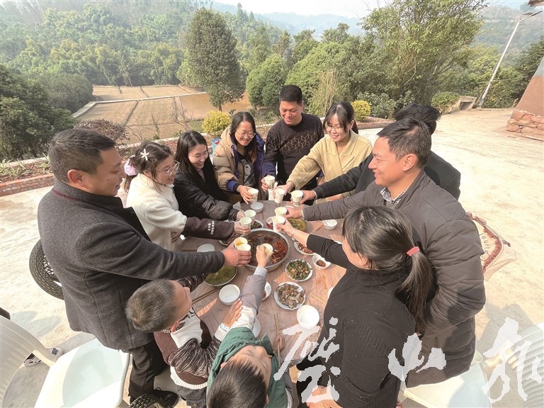 “開飯了喲!”不一會(huì)兒,張艷端著一盤蒜苗炒臘肉上桌,豆花、水煮魚、折耳根……看著滿桌豐盛的飯菜,她笑著跟朋友們說,“今天這桌菜我們每個(gè)人都參與了的,絕對(duì)巴適!”
