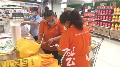 疫情防控期間,網(wǎng)上訂單大幅增長。據(jù)重百商場客戶經(jīng)理甘紅梅介紹,為減少居民外出聚集帶來的風(fēng)險(xiǎn),借助多點(diǎn)App、微信小程序等平臺提供線上點(diǎn)單服務(wù),用戶可在每天7:30—20:30期間點(diǎn)單,由第三方平臺配送到家。同時(shí),要求揀貨員、配送員佩戴口罩、手套進(jìn)行無接觸配送,確保市民買到放心菜、安全菜。