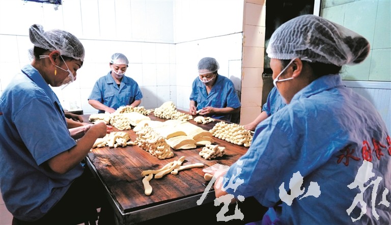 在制作室里,工人將搓揉勁道的面團(tuán)切成一條一條的,再熟練地搓揉捻扯,瞬間就變成一個(gè)個(gè)大小均勻的麻花。