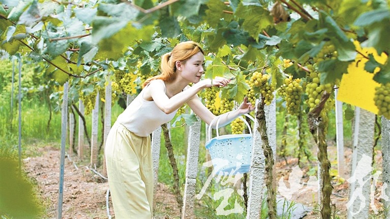 前來此處采摘游玩的游客絡繹不絕。他們三三兩兩結伴穿梭園內,或體驗采摘的樂趣,或與鮮美的葡萄拍照留念,盡享田園風情。