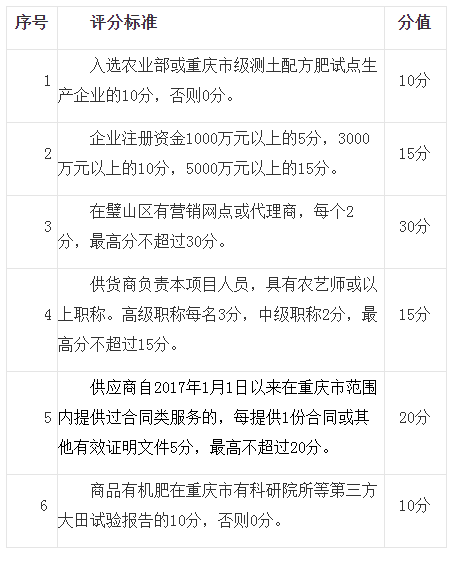 本次遴選采用綜合評(píng)分方式,重慶市璧山區(qū)農(nóng)業(yè)農(nóng)村委員會(huì)組織專(zhuān)家對(duì)符合條件的報(bào)名供應(yīng)商響應(yīng)文件按下列分項(xiàng)及標(biāo)準(zhǔn)進(jìn)行評(píng)審打分、總分100分,累計(jì)得分從高到低排序前3家報(bào)名供應(yīng)商確定為《璧山區(qū)2020年有機(jī)肥推廣示范項(xiàng)目》商品有機(jī)肥供應(yīng)商。