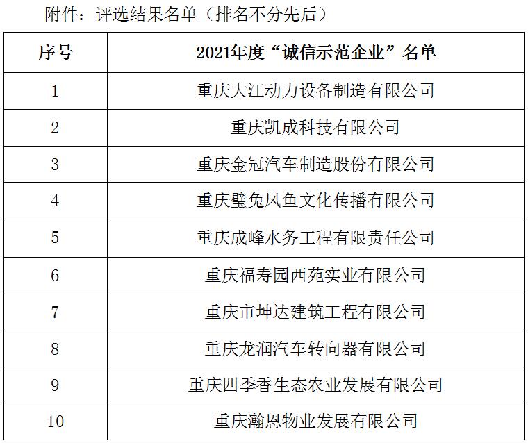 1月20日,區(qū)信用協(xié)會(huì)公布璧山區(qū)2021年度“誠(chéng)信示范企業(yè)”公示名單,包括重慶大江動(dòng)力設(shè)備制造有限公司、重慶凱成科技有限公司等10家企業(yè)成功上榜,公示時(shí)間為1月20日-1月25日。