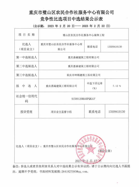 重慶市璧山區(qū)農(nóng)民合作社服務(wù)中心有限公司 競(jìng)爭(zhēng)性比選項(xiàng)目中選結(jié)果公示表