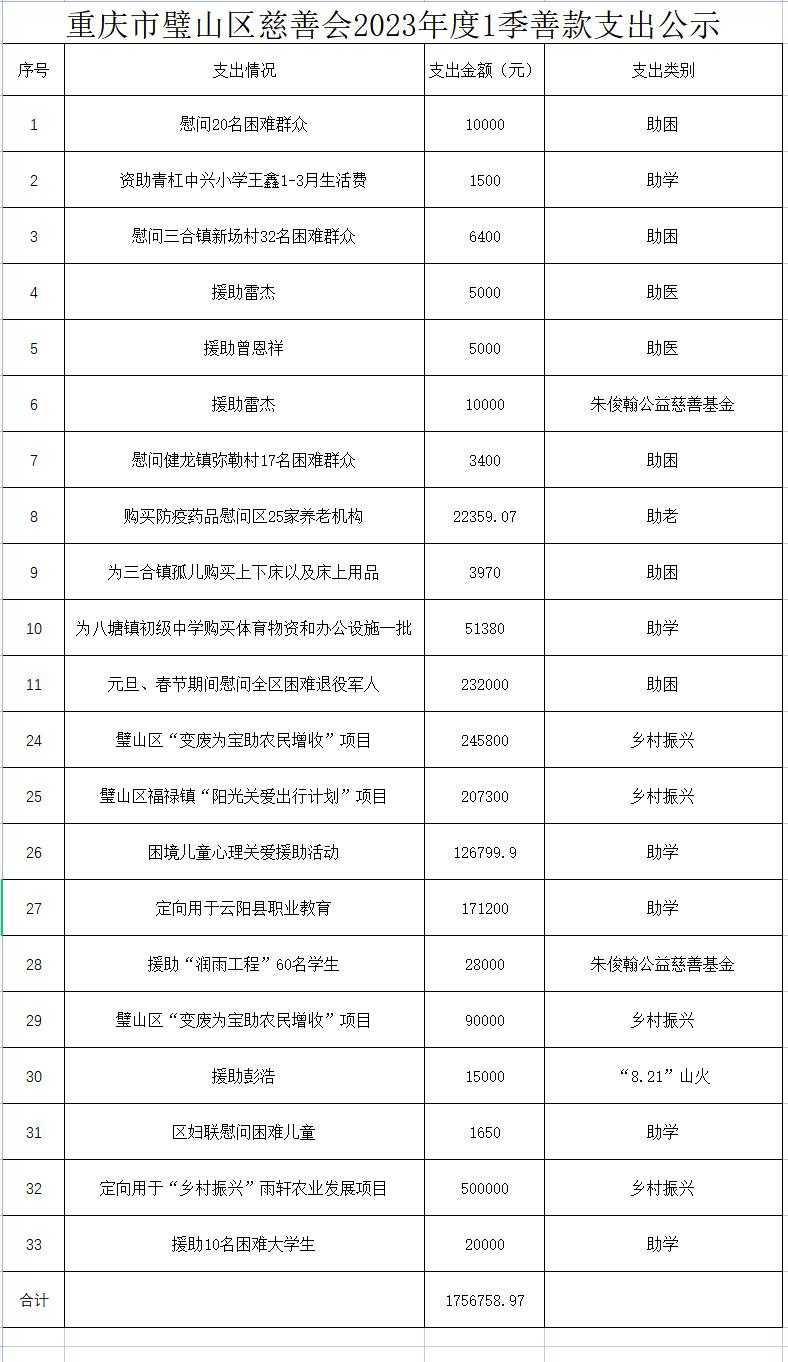 重慶市璧山區(qū)慈善會2023年度1季善款支出公示