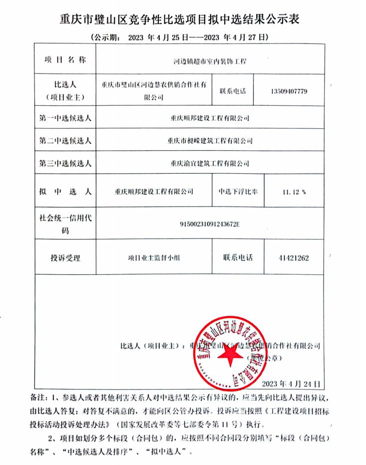 重慶市璧山區(qū)河邊惠農(nóng)供銷合作社有限公司河邊鎮(zhèn)超市室內(nèi)裝飾工程比選結(jié)果公示