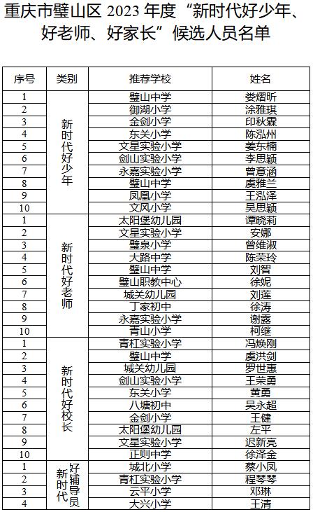 為深入貫徹落實(shí)黨的二十大精神,貫徹落實(shí)習(xí)近平總書記關(guān)于青少年成長成才、加強(qiáng)家風(fēng)家教和師德師風(fēng)建設(shè)等方面的重要講話精神,按照市委宣傳部、市文明辦、市教委、團(tuán)市委、市婦聯(lián)、市關(guān)工委《關(guān)于開展重慶市2023年度“新時代好少年、好老師、好家長”學(xué)習(xí)宣傳活動的通知》(渝文明辦〔2023〕8號文件)文件要求,3月27日,區(qū)委宣傳部、區(qū)文明辦聯(lián)合區(qū)教委、團(tuán)區(qū)委、區(qū)婦聯(lián)、區(qū)關(guān)工委啟動了璧山區(qū)2023年度“新時代好少年、好老師、好家長”學(xué)習(xí)宣傳活動。經(jīng)推薦、評審、審核、審定等程序,推選出10名“新時代好少年”、10名“新時代好老師”、10名“新時代好校長”、4名“新時代好輔導(dǎo)員”、10名“新時代好家長”?,F(xiàn)將名單予以公示,面向社會接受群眾監(jiān)督。
