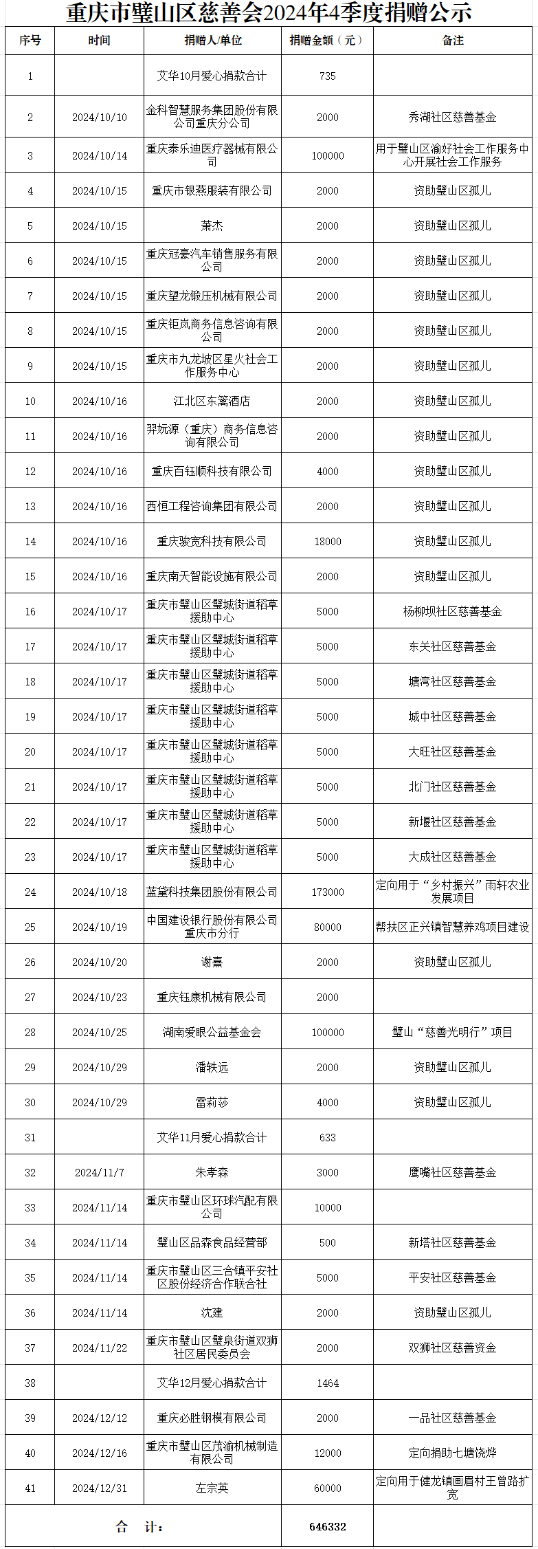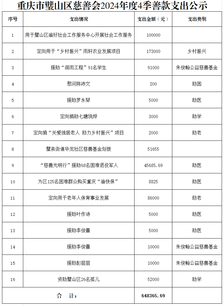 重慶市璧山區(qū)慈善會(huì)2024年度4季善款捐贈(zèng)和支出公示