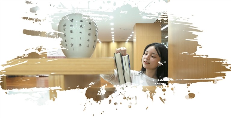 在圖書館大廳,承重柱被設(shè)計為落空錯落的“博古架”樣式,正好將民國時期花鳥罐置于其中,為這簡潔硬朗的線條增添了幾分柔和。