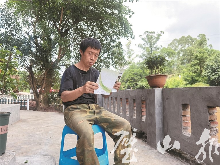 楊明建在院壩學習養(yǎng)殖技術書籍