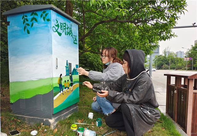 4月6日,來(lái)自四川美術(shù)學(xué)院的大學(xué)生們正在雙星大道人行道旁的配電箱上繪制文明城區(qū)彩繪宣傳畫?!爱嫀煛眰冇檬种械漠嫻P,為城區(qū)一個(gè)個(gè)配電箱穿上了靚麗的“新衣”,傳遞文明新風(fēng)尚,營(yíng)造良好的創(chuàng)建全國(guó)文明城區(qū)氛圍,讓文明意識(shí)深入人心。(記者 周春雷 攝)