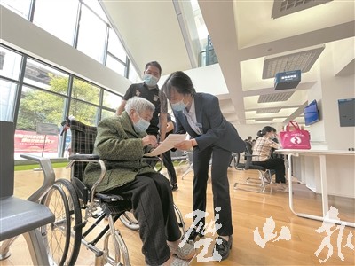 工作人員幫助行動不便的老年人辦理業(yè)務(wù)