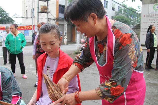 大路街道志愿者向六塘小學(xué)學(xué)生講解包粽子方法