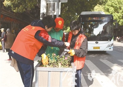 志愿者撿拾花壇內(nèi)雜物