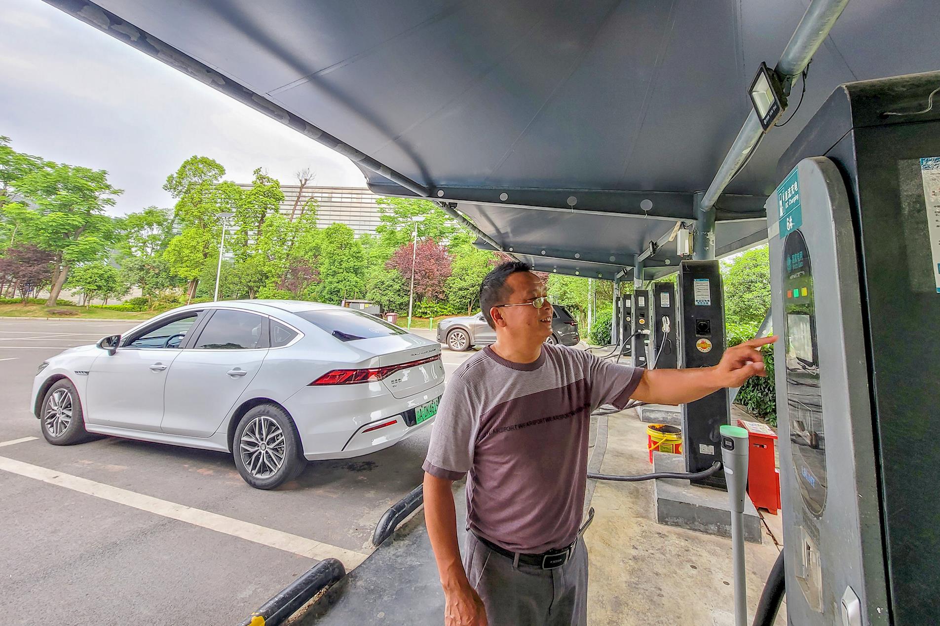 4月27日,東岳廣場(chǎng)生態(tài)停車場(chǎng),市民正為新能源汽車充電。為加快新能源汽車推廣,倡導(dǎo)低碳出行,著力打造綠色生活方式,今年我區(qū)將繼續(xù)安裝公共充電樁100個(gè),建成電瓶車充電裝置50處,為市民綠色出行“加油”。