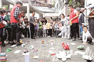 區(qū)人民醫(yī)院志愿者與天湖花園小區(qū)孩子們一起做游戲(記者 巫秋云 攝)