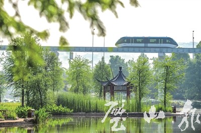 6月22日,一列云巴途經(jīng)綠樹(shù)成蔭的秀湖公園上空,與六角亭疊穿而過(guò),新科技與古建筑的完美碰撞,讓璧山“潮味”十足,成為小城又一道靚麗的交通風(fēng)景線。
