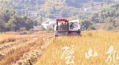 在該鎮(zhèn)浸口村大米種植基地,萬里晴空和金黃稻穗相互映襯,400多畝顆粒飽滿的稻穗壓彎了稻桿。伴隨著陣陣轟鳴,收割機在稻田里來回穿梭,收割、脫粒、粉碎稻桿等工序一氣呵成,田野上呈現一幅忙碌的豐收畫卷。