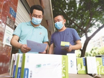8月11日,記者在區(qū)應(yīng)急局物資倉庫處看到,來鳳街道、三合鎮(zhèn)等鎮(zhèn)街防疫工作人員正排隊領(lǐng)取口罩、體溫槍、防護服、消毒液、身份證識別儀等醫(yī)療物資,核對物資數(shù)量、簽字、領(lǐng)取,現(xiàn)場秩序井然。