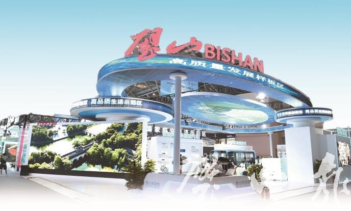 璧山展館位于重慶國博中心N2館,展館面積350平方米。展館為凸顯璧山“高質(zhì)量發(fā)展樣板區(qū)”“高品質(zhì)生活示范區(qū)”的城市定位,以“科技藍”為主色系,采取全開放式設(shè)計,頂部采用“智慧之眼”元素作為主要造型,輔以智能設(shè)備點綴,科技感十足。