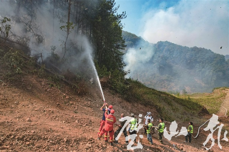 8月24日傍晚,記者在八塘鎮(zhèn)森林防區(qū)偶遇一對(duì)同時(shí)上陣的“父子兵”,他們分別是53歲的龐澤興和他25歲的兒子龐信舟,兩人被分在了黨政機(jī)關(guān)干部突擊隊(duì)同一小組,并肩上陣阻擊山火蔓延。