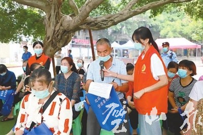 “廢舊家具等體積大、整體性強的大件垃圾,應當投放到哪里?”“我知道,投放到指定地點或預回收”“恭喜答對了,獎品送上!”……活動以主持人提問,臺下觀眾搶答的方式進行。競答現(xiàn)場,主持人話音未落,大家就已迫不及待地舉手搶答。答對題目后,一旁的工作人員為居民送上了抽紙、香皂、垃圾袋等禮品予以鼓勵。除了答題,街道工作人員和志愿者還向居民發(fā)放了印有垃圾分類宣傳標語的布袋以及創(chuàng)文宣傳冊等。