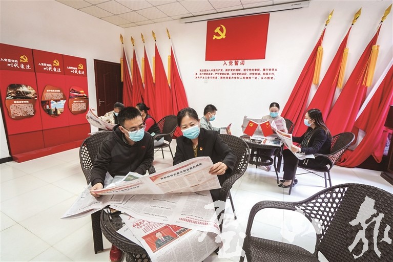 10月17日,璧城街道城中社區(qū)組織社區(qū)干部讀報,學(xué)習(xí)黨的二十大報告精神。(首席記者 謝捷 攝)