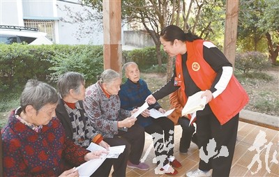 在河邊鎮(zhèn),志愿者為居民發(fā)放“住得文明”宣傳資料。