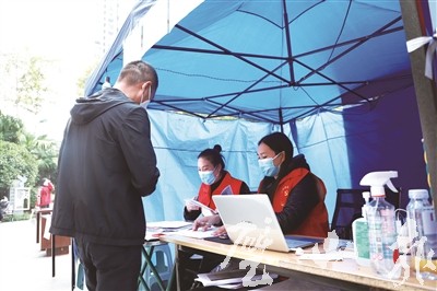 “你好,請出示一下通行證。”11月20日,在璧蘭河1號小區(qū)門口,記者看到,幾名黨員正在對進(jìn)入小區(qū)的居民檢查核酸檢測證明,并仔細(xì)核對人員信息。