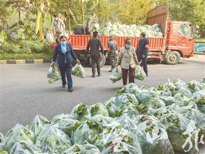 11月25日,一輛滿載新鮮蔬菜的貨車??吭阼等值纼山愒沸^(qū)門口,社區(qū)工作人員有序地將蔬菜進(jìn)行卸貨、分裝、配送。