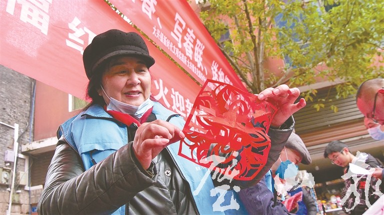 在大興鎮(zhèn),趕場(chǎng)的居民將志愿者們圍成一圈,大家都爭(zhēng)相讓志愿者幫自己寫(xiě)下春聯(lián)。來(lái)自船形村5組的陳婆婆拿著春聯(lián)高興得合不攏嘴,“一年四季行好運(yùn),八方財(cái)寶進(jìn)家門(mén)。”陳婆婆大聲念著自己的春聯(lián)。而另一位居民王大姐則選擇了窗花剪紙,“這個(gè)紅窗花貼在窗戶上肯定特別喜慶。”她說(shuō)。