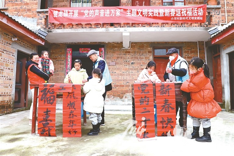 “新春佳節(jié)將至,通過寫春聯(lián)的方式將黨的二十大精神和新春祝福送到群眾手中,既讓村民感受到傳統(tǒng)文化的魅力,又推動了黨的二十大精神走進千家萬戶?!苯↓堟?zhèn)相關負責人表示。