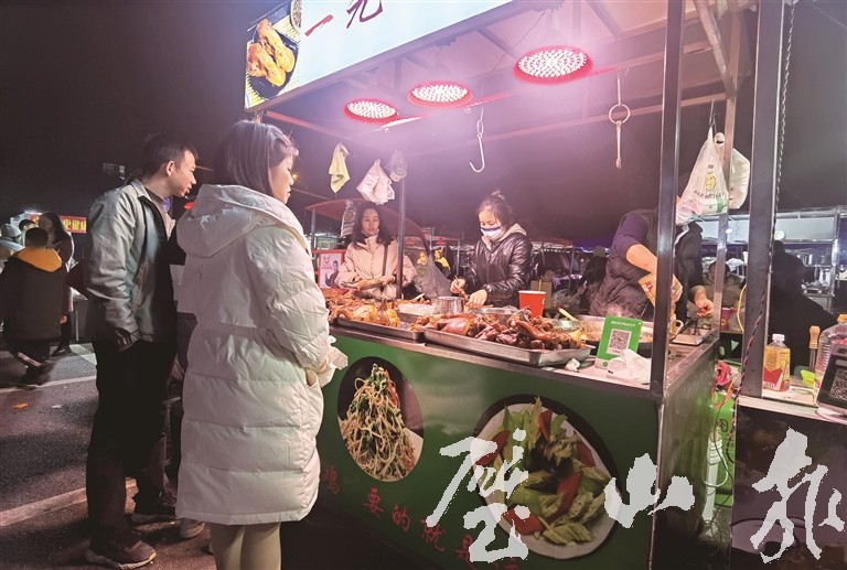 夜幕降臨、華燈初上,陣陣叫賣聲和歡笑聲響徹夜空,百米長的夜市人流如潮,攤販?zhǔn)圪u的商品琳瑯滿目,檔口各式美食吸引了不少市民前來打卡。