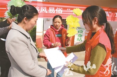 健龍鎮(zhèn)志愿者用鮮花換取群眾紙錢,并宣傳移風(fēng)易俗知識(shí)。