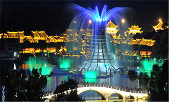 音樂噴泉緊鄰秀湖水街,由一個塔式和8個獨立噴泉陣組成,塔身高約30米。不定期上演萬眾一心、孔雀開屏等8大主題“大型水舞秀” ,8股水花或一起噴涌或 次第而出,令無數(shù)游人醉迷于美輪美奐的視聽盛宴,觀感極佳。