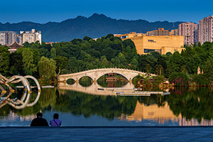 天子橋,是一座彎月造型的石拱橋,是為紀念明代建文帝朱允炆在璧山的隱居生活而修建。此外,天子橋、龍隱閣、龍門瀑布、隱帝流光坊等都是為了藝術化再 現(xiàn)當年建文帝在璧山的隱居生活。