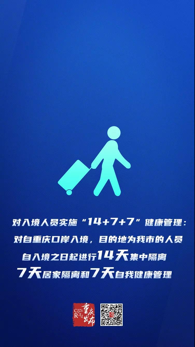 ①對自重慶口岸入境,目的地為重慶的人員,自入境之日起進行14天集中隔離,7天居家隔離和7天自我健康管理。在7天自我健康管理期間,不乘坐公共交通工具、不參加聚集聚會活動、不到封閉的公共場所。7天居家隔離和7天自我健康管理期間,如有發(fā)熱、咳嗽等癥狀要立即報告所在的社區(qū)。