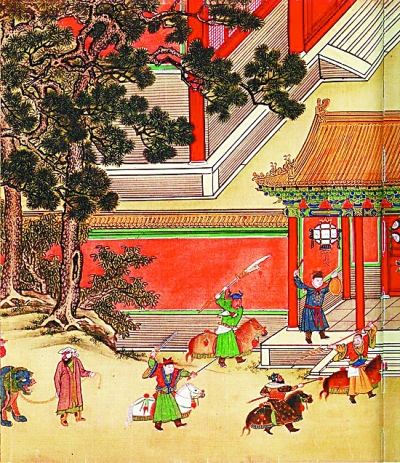從右至左觀看,畫面第一段描繪的是明憲宗朱見深身著繡金龍袍,頭戴黑色便帽,坐在臺上的黃色帳篷中觀看太監(jiān)、童子燃放煙花爆竹的場景。畫中煙花的種類繁多,有可以如竹竿般舉著的,有可以插在地上的,有可以拿在手中揮舞的,還有可以吊著的……在畫面的右下方,還有童子從長方形的紅木箱子中拿出成串的煙花來。這些奇妙的光暈使得畫面中的所有人都沉浸在夢幻的歡愉中,而煙花的燃放也暗示了時(shí)間并非白天。透過一扇敞開宮門的紅墻,進(jìn)入到了畫面的第二段,首先映入眼簾的便是一個(gè)推車、一個(gè)挑擔(dān)但都滿載貨物的貨郎。此時(shí)的憲宗直身站立在殿前石臺的右側(cè),身旁的宮人們則牽引著童子朝畫面中心早已做好了準(zhǔn)備的貨郎及貨架走去,稍大點(diǎn)的孩童手中都拿著各色彩燈,有太平有象燈、馬到成功燈、蟾宮折桂燈等,無一不蘊(yùn)含著美好的祝愿。在一段曲折的紅墻邊,開始了畫面的第三段,這一段中的憲宗沒有位于畫面的中心,而是位于整個(gè)畫幅的最左邊。由左向右行進(jìn),各種驚險(xiǎn)刺激的雜耍扣人心弦,伴隨著奏樂向右行進(jìn)的外國使節(jié)模樣的獻(xiàn)寶隊(duì)伍中,領(lǐng)頭的人手牽瑞獸,其余的則多肩扛珊瑚,顯示出帝國的強(qiáng)盛,在節(jié)慶歡愉之外,增添了強(qiáng)烈的政治寓意,從而使其在民俗價(jià)值上又增加了歷史價(jià)值。他們身前的各色戲曲變裝人物則沿著紅墻,往畫面第二段走去,從而讓畫面成為一個(gè)有機(jī)互動(dòng)的歡愉整體。