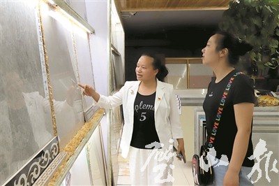 5月7日,在大路街道北街一家建材經(jīng)營部,楊明義正在為顧客介紹瓷磚。在正對大門墻上的醒目位置,掛著一塊“共產(chǎn)黨員明星經(jīng)營戶”的牌子,吸引了不少顧客的注意力。